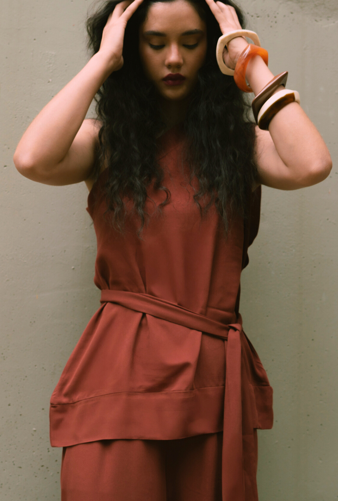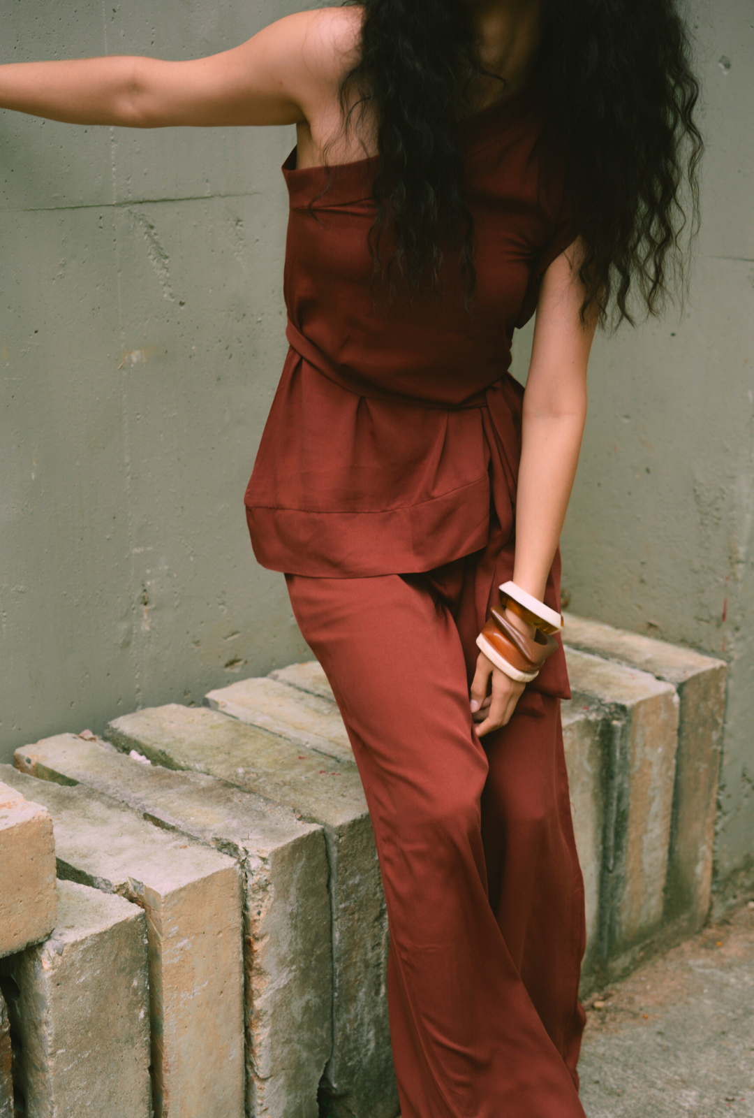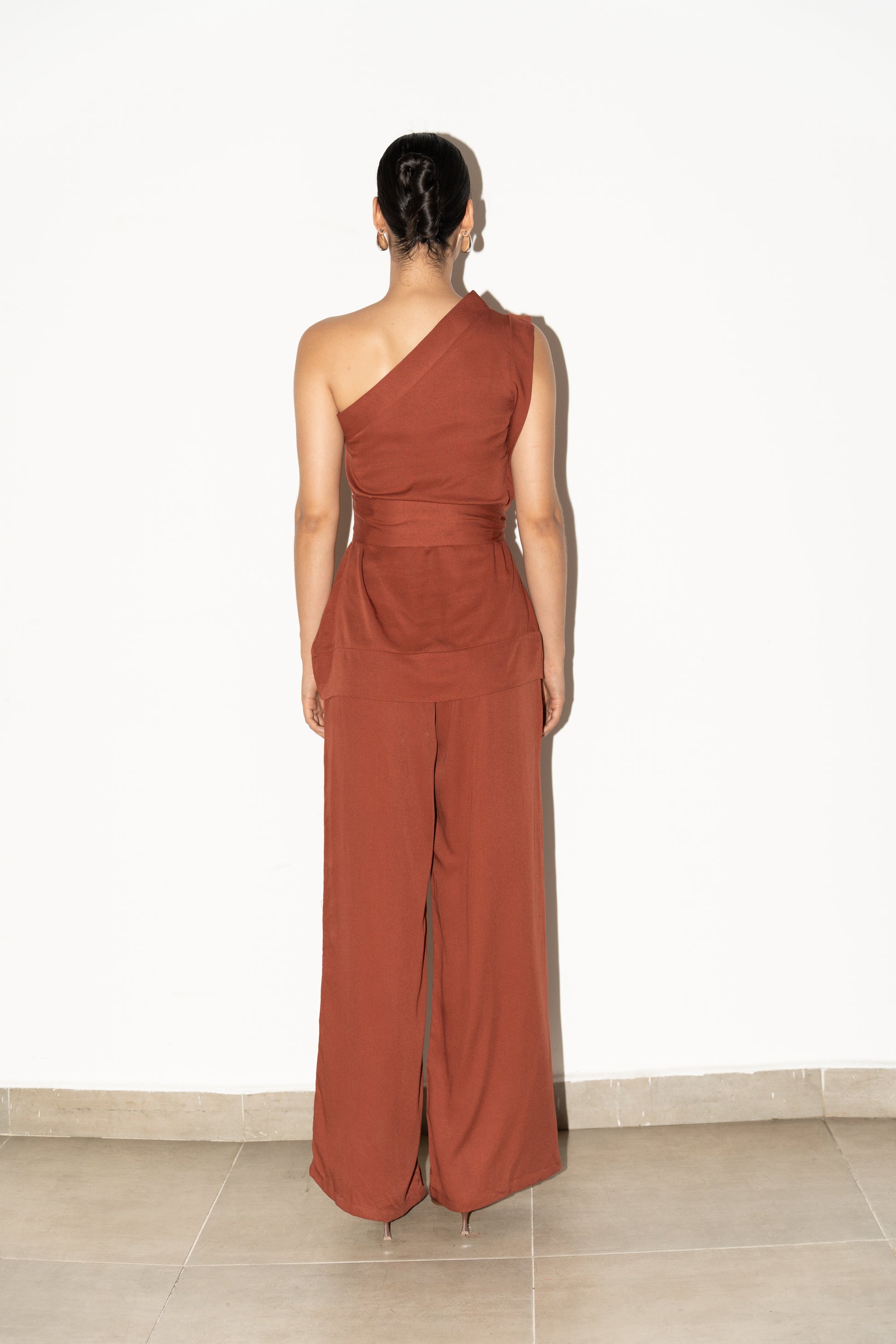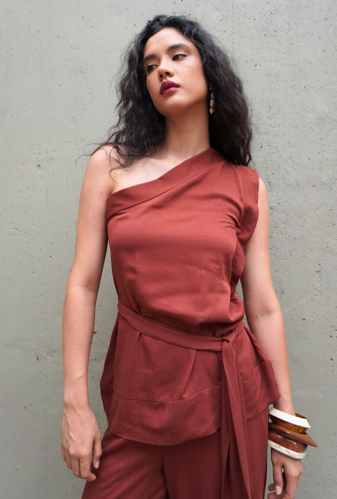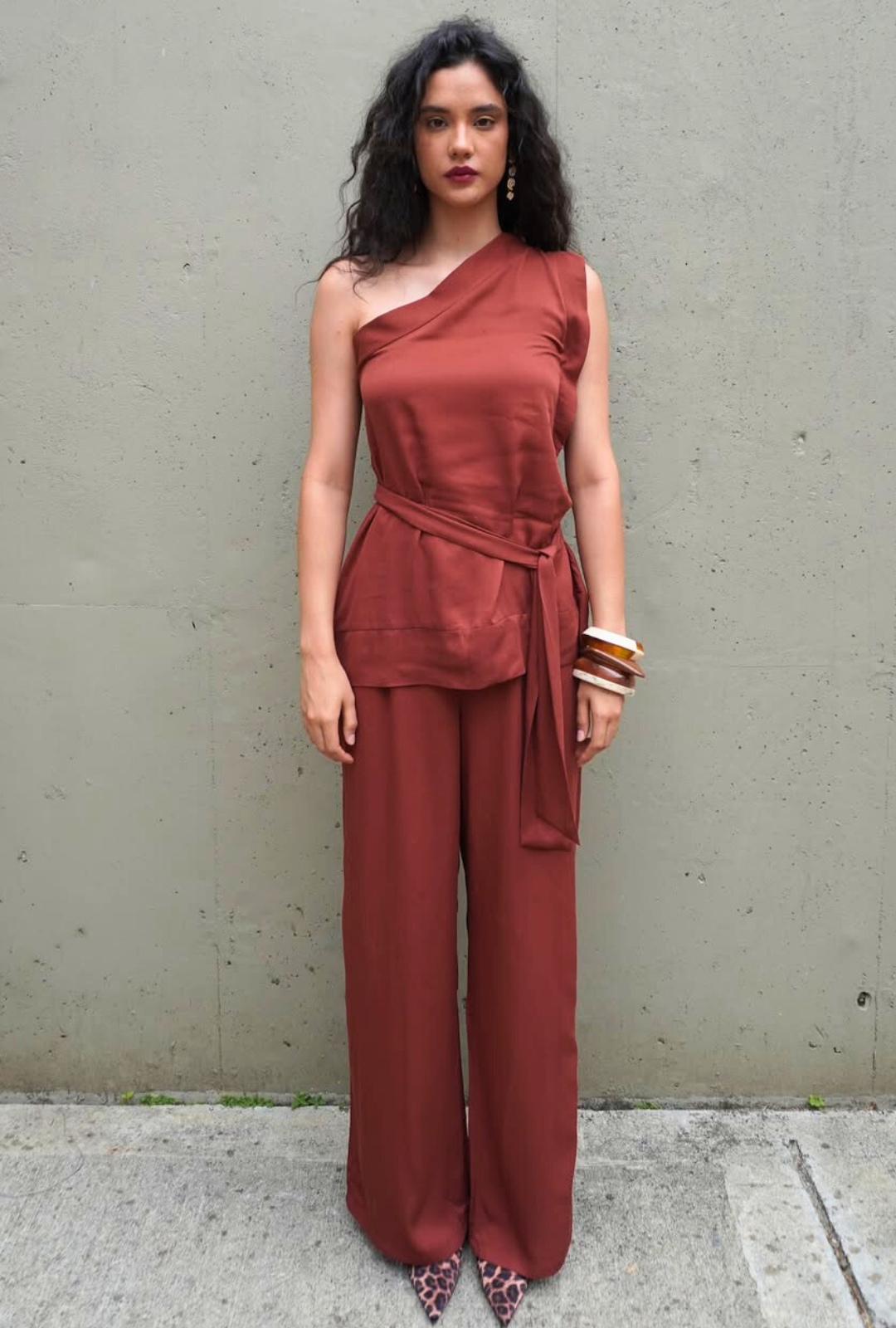 Este conjunto de un solo hombro redefine la elegancia moderna. Su diseño asimétrico resalta los hombros con sutileza, mientras que el cinturón ajustable marca la cintura creando una silueta equilibrada y femenina. El pantalón de caída amplia aporta movimiento, comodidad y un aire sofisticado que estiliza la figura.