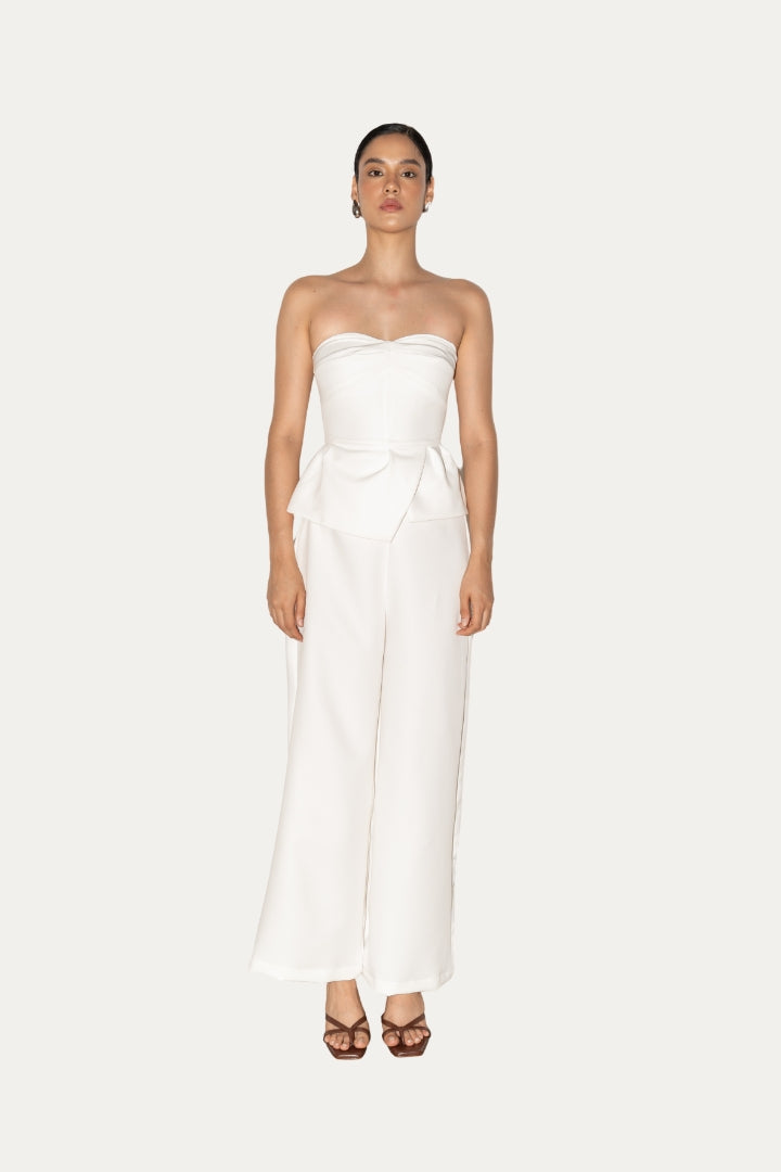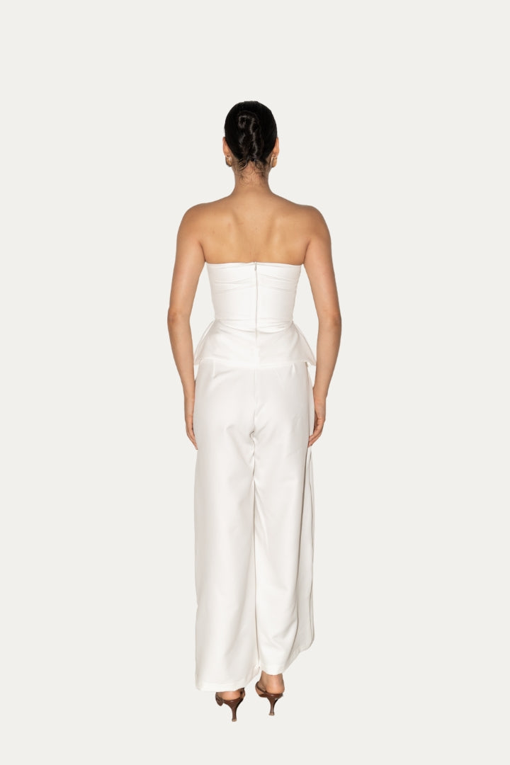 Minimalista, sofisticado y atemporal — este enterizo es la pieza perfecta para mujeres que valoran la elegancia moderna con un toque de poder. Su diseño strapless estructurado realza los hombros y el escote con delicadeza, mientras que el detalle tipo péplum en la cintura define la silueta y crea un efecto visual que estiliza el cuerpo.
