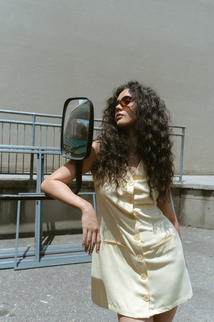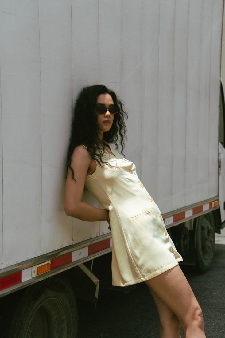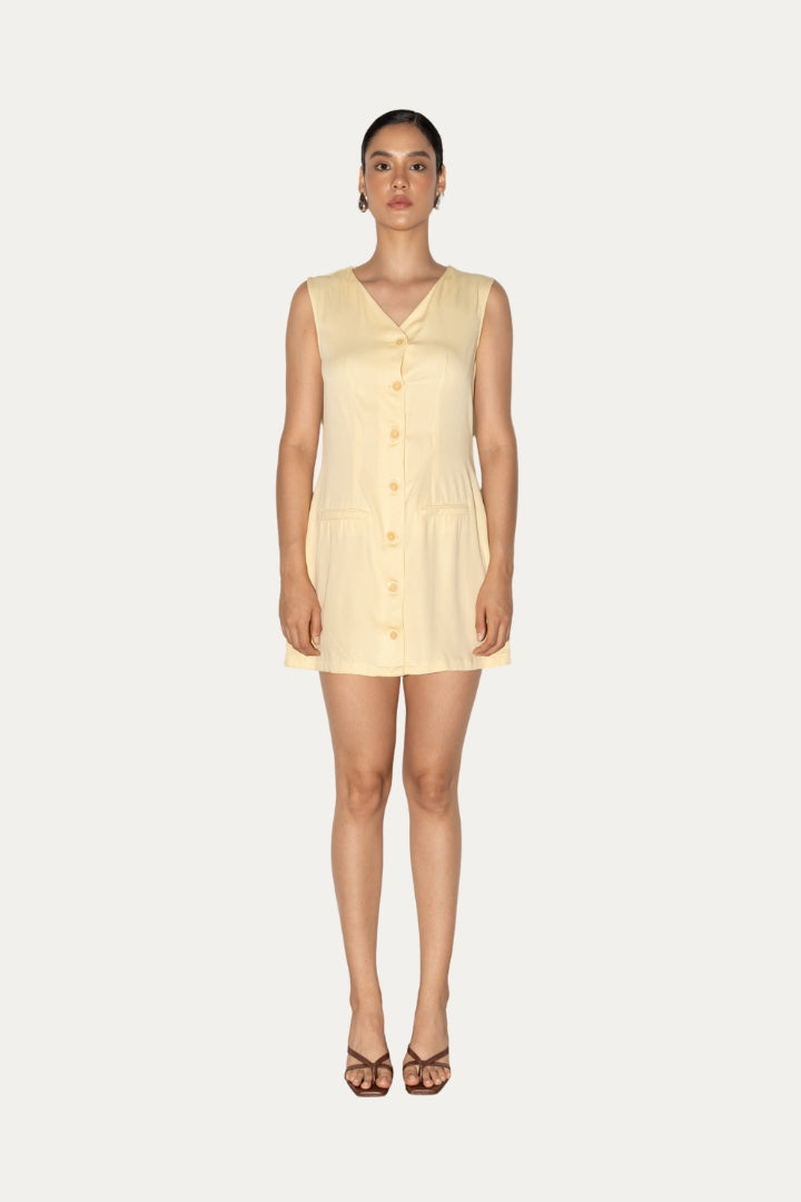 Vestido corto sin mangas en tono vainilla, con escote en “V” y botones frontales que aportan un toque clásico y femenino. Su silueta ligera y caída suave lo convierten en una prenda perfecta para los días cálidos.